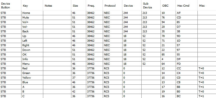 Wow, thanks guys. Will try it out when my remote arrives on Saturday. The hex codes were so long I didn't know how it correlated to the format used by RemoteMaster.