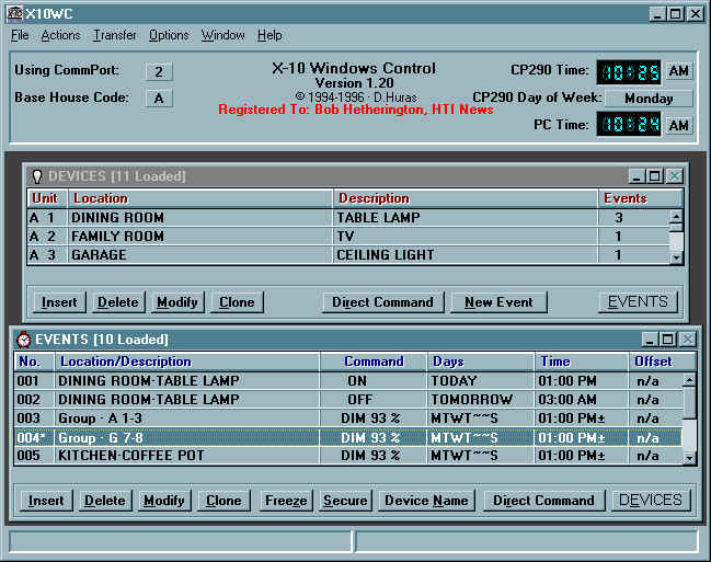 Once you're all set up you save the schedule file and download the events to the CP290. You can also print lists of your events and devices for reference. There are many other features incorporated in X10WC including a CP290 Self-Test, PC / CP290 Clock Synchronization, Sunrise / Sunset scheduling etc. The best way to check it out is to download a copy (420 KB .zip file) from David's web site and try it out for 30 days. You don't need the CP290 installed to review the software and for those of you unsure of what it (CP290 controller) can do, this is the best way to make an evaluation before you buy it. If you like the software, there's clear and easy instructions for registration ($32 US or CAN depending on where you live). This is an especially good deal for us Canadian guys eh!