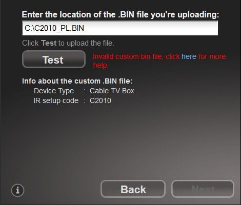 If you get this error message there are 2 possibilities. The first is that you are using the wrong (RV or PL) file for your Slingbox, so try the other. For the other possibility you have to realise that it does not mean ‘Invalid Custom BIN file’. It actually should read ‘Custom Remote BIN file not found’, so the likelihood is that you have not typed in the file path and filename correctly. Not sure why Sling did not use a more appropriate message in this case.