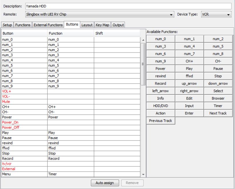 This is where you map the defined functions onto the available buttons. Simply tap the Auto-Assign button which should allocate most of the buttons. For any buttons left in red drag the function name from the table on the left to the function column on the right. But note that not all these buttons are available on a Slingplayer Generic Remote. For example the 'Slow' and 'Eject' buttons do not exist on a Generic Remote. So only map the functions onto the buttons that actually exist (You will see that when you check out the Layout Tab, and from experience when you have done this a few times).