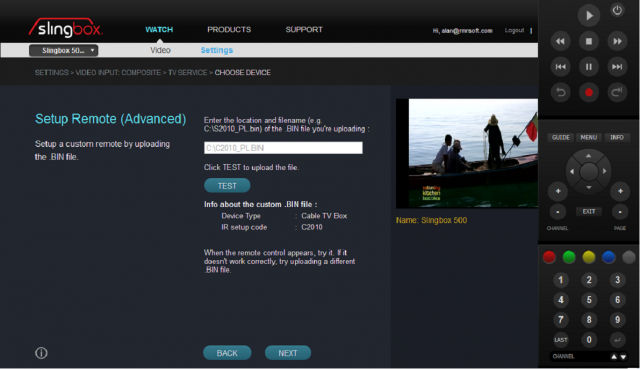 Now tap the TEST button to download the BIN file to the Slingbox.