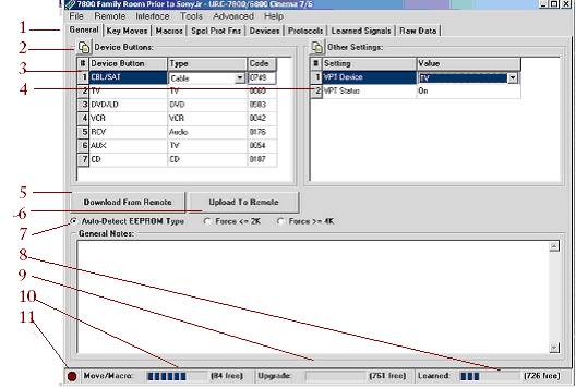 Note that there are tabs at the top of the screen. You use these tabs to change to the KeyMoves, Macros, Special Protocols, Devices, Protocols, Learned Signals or Raw data. |