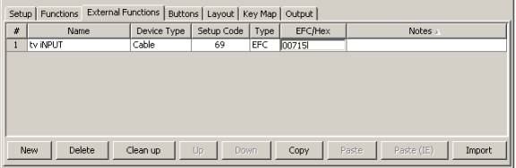 Sometimes you need functions from another setup code/upgrade in order to get a complete function list. These functions would be setup as keymoves. The External Functions tab allows these to be included when you assign functions to buttons. The grid will contain all the information that is necessary to setup a keymove. Device/Setup code