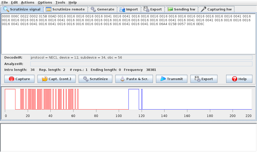 - If suitable capturing hardware is connected and opened, pressing Capture will capture an IR signal form the hardware, and scrutinize it.