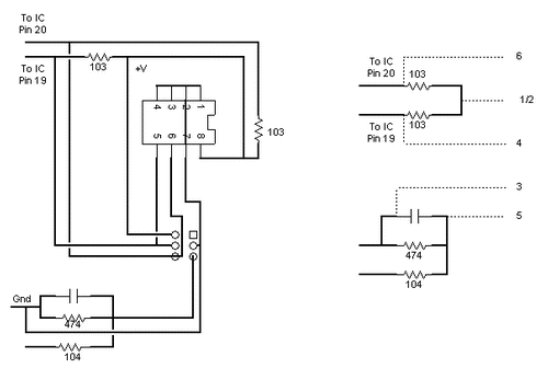 A quick study of both circuits results in the following schematics. The lefthand circuit shows how the JP1 connector, EEPROM and components are connected to pins 19 and 20 of the remote IC on the PCB that has spaces for them. The righthand circuit shows how we can connect up the 6 pin header and EEPROM to add JP1 functionality on the PCB that doesn't. |