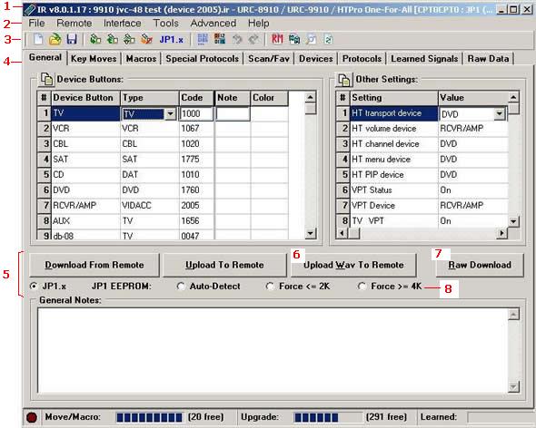 For example, this screen has a bunch of different options that will be different than yours. The title(1) display can be expanded in the tools options, the toolbar (3) can be turned on and off and the icons may be different depending on options. The tabs (4) available change depending on what features the remote has. The middle button area(5) can be hidden shown in the options menu. shown. Some buttons, such as the Upload Wav to remote button (6) will only show when a remote that support wav upgrades are shown. Some buttons like the Raw Download(7) can be turned on by selecting an option from the Advanced menu, and others like the EEPROM type buttons (8) can be toggled on and off in the tools options menu. Even the menu items(2) can be missing or suddenly appear on the menu. Make sure to read the section on the menu to see how to control these options.